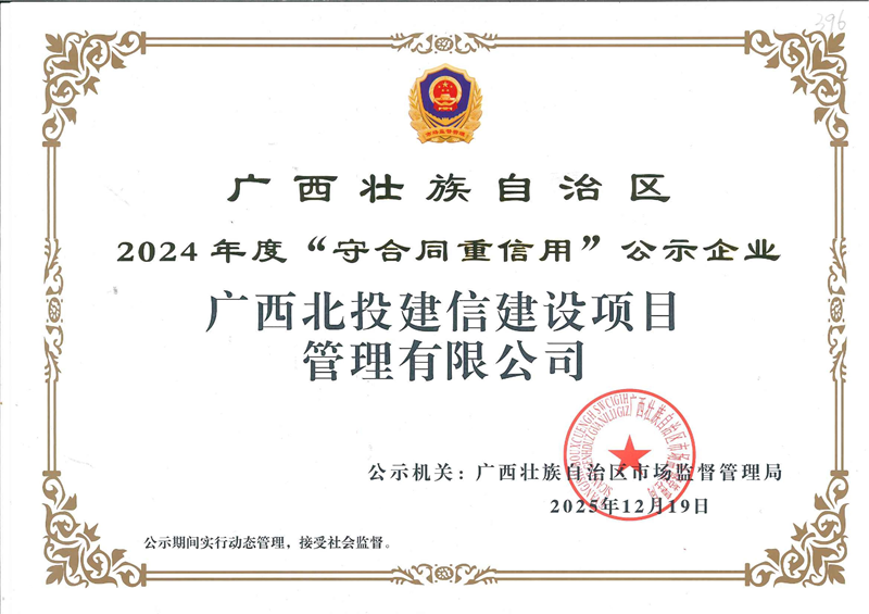 北投建信公司荣获2024年度广西“守合同 重信用”公示企业称号