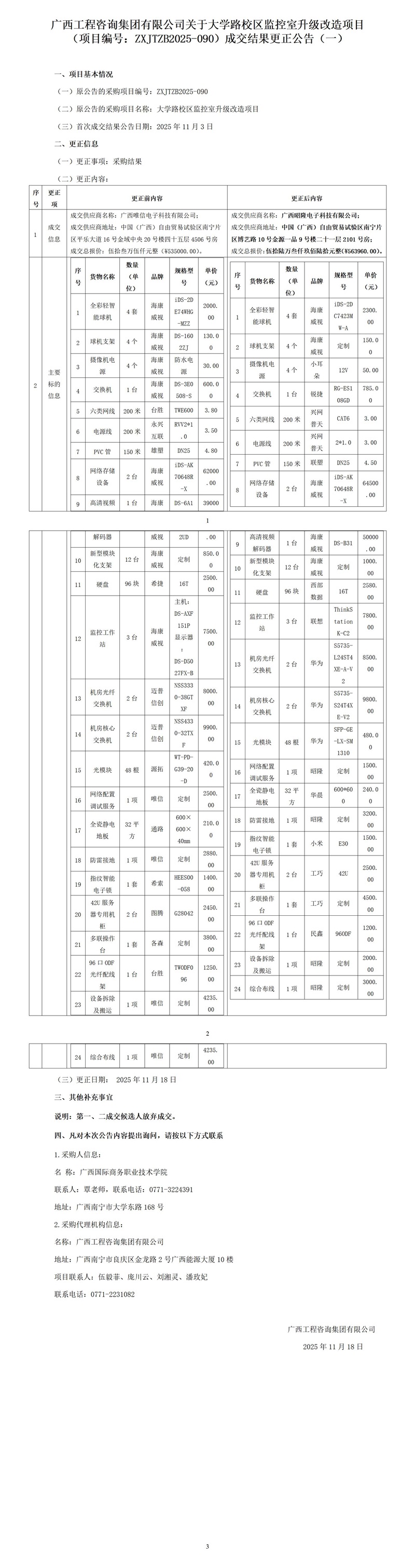 广西工程咨询集团有限公司关于大学路校区监控室升级改造项目 (项目编号:ZXJTZB2025-090)成交结果更正公告(一)